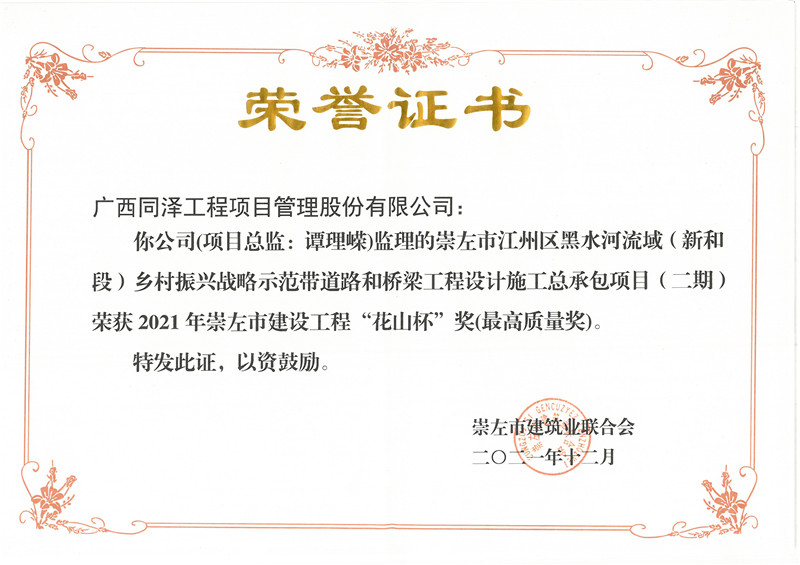 崇左市江州區(qū)黑水河流域(新和段)鄉(xiāng)村振興戰(zhàn)略示范帶道路和橋梁工程設計施工總承包項目(二期)項目榮獲2021年崇左市建設工程“花山杯”獎(最高質量獎)